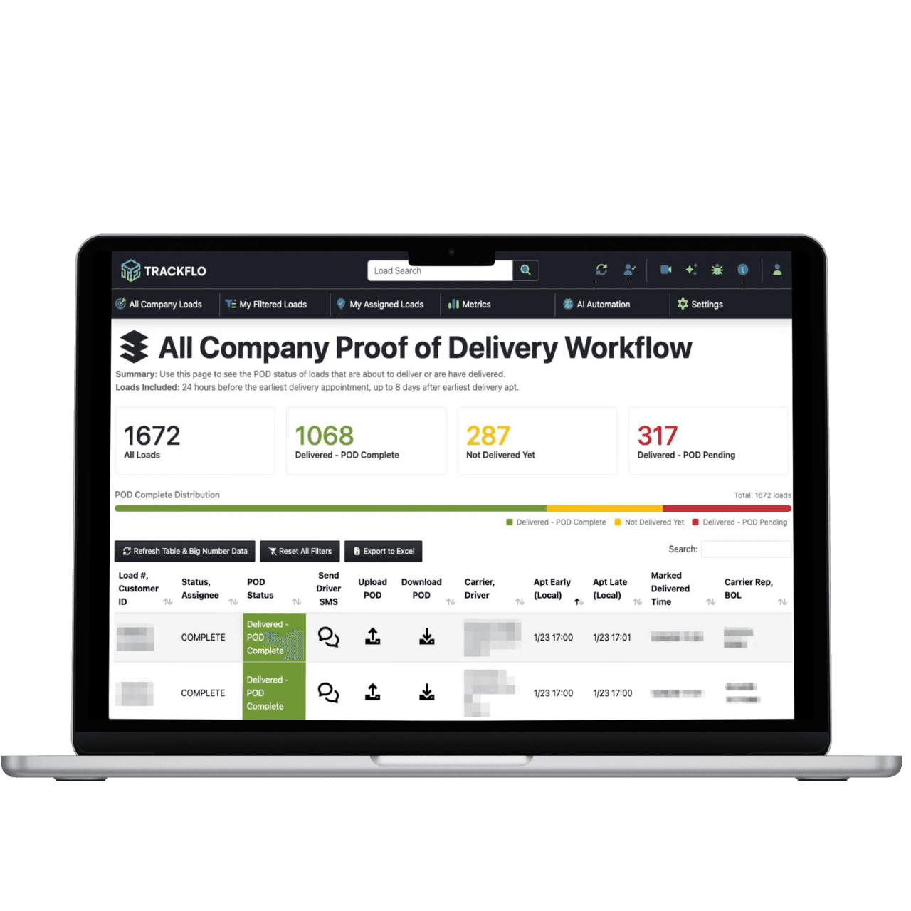 For those PODs that inevitably fall through the cracks, we provide a robust POD Workflow, which gives a clear picture of what loads have and don't have PODs. Trackers can easily SMS drivers and email carriers to get them manually, then upload the PODs in TrackFlo to send to all your systems and email them to your accounting team.