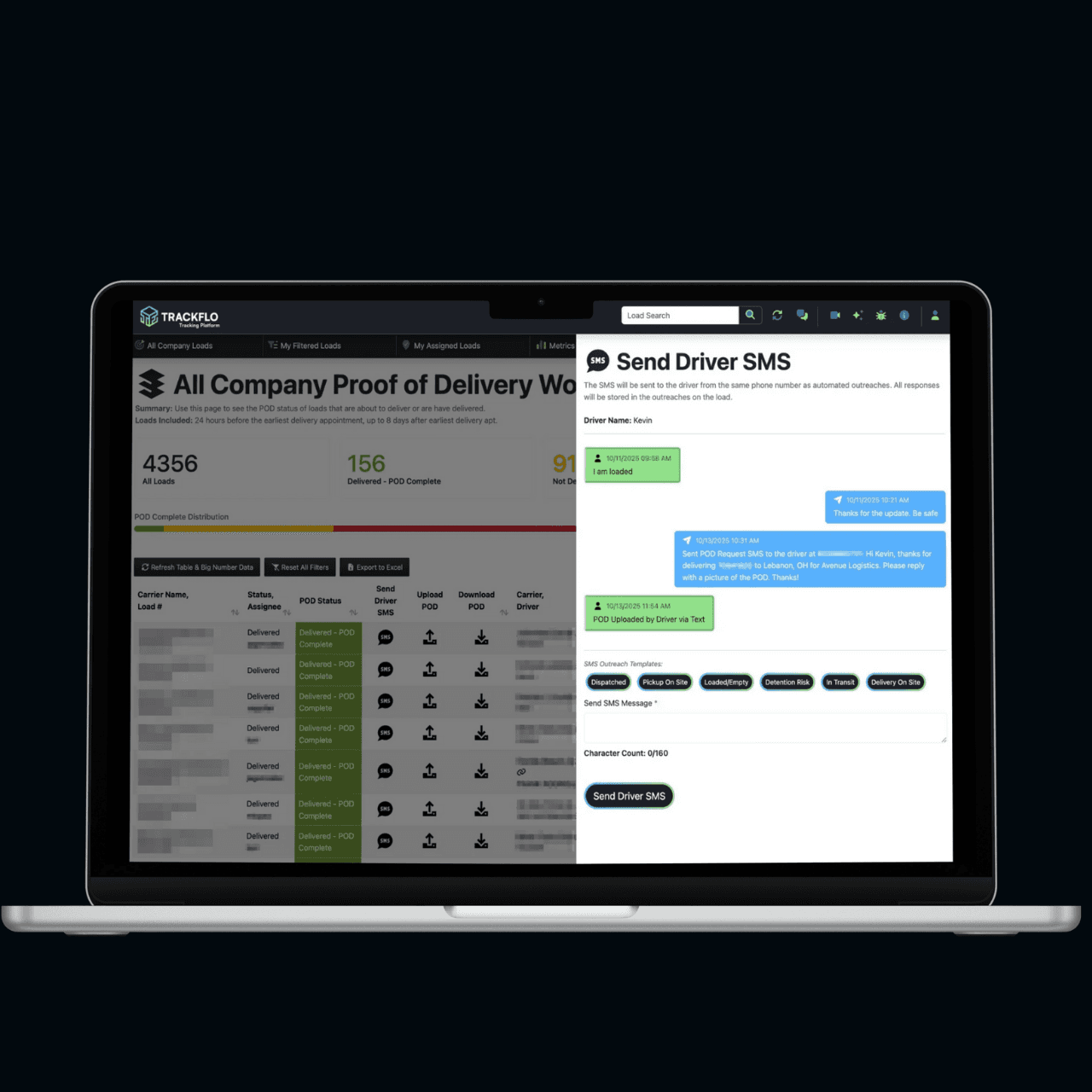 Beyond just load updates and driver info updates, your team can send SMS to drivers and emails from TrackFlo which helps them get work done faster.
